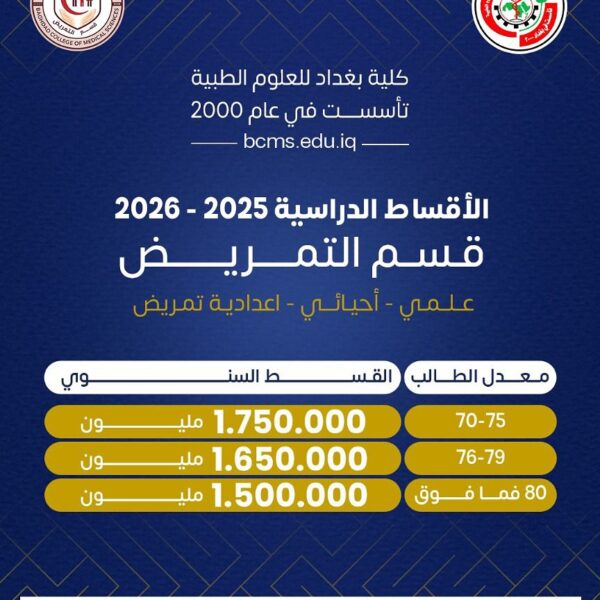 كلية بغداد ترحب بالطلبة الجدد وتعلن عن الاجور الدراسية للطلبة المقبولينAsraa.w89@gmail.com09/14/2025كلية بغداد للعلوم ترحب بالطلبة الجدد وتعلن عن الاجور الدراسية للطلبة المقبولين ... اقرأ المزيد